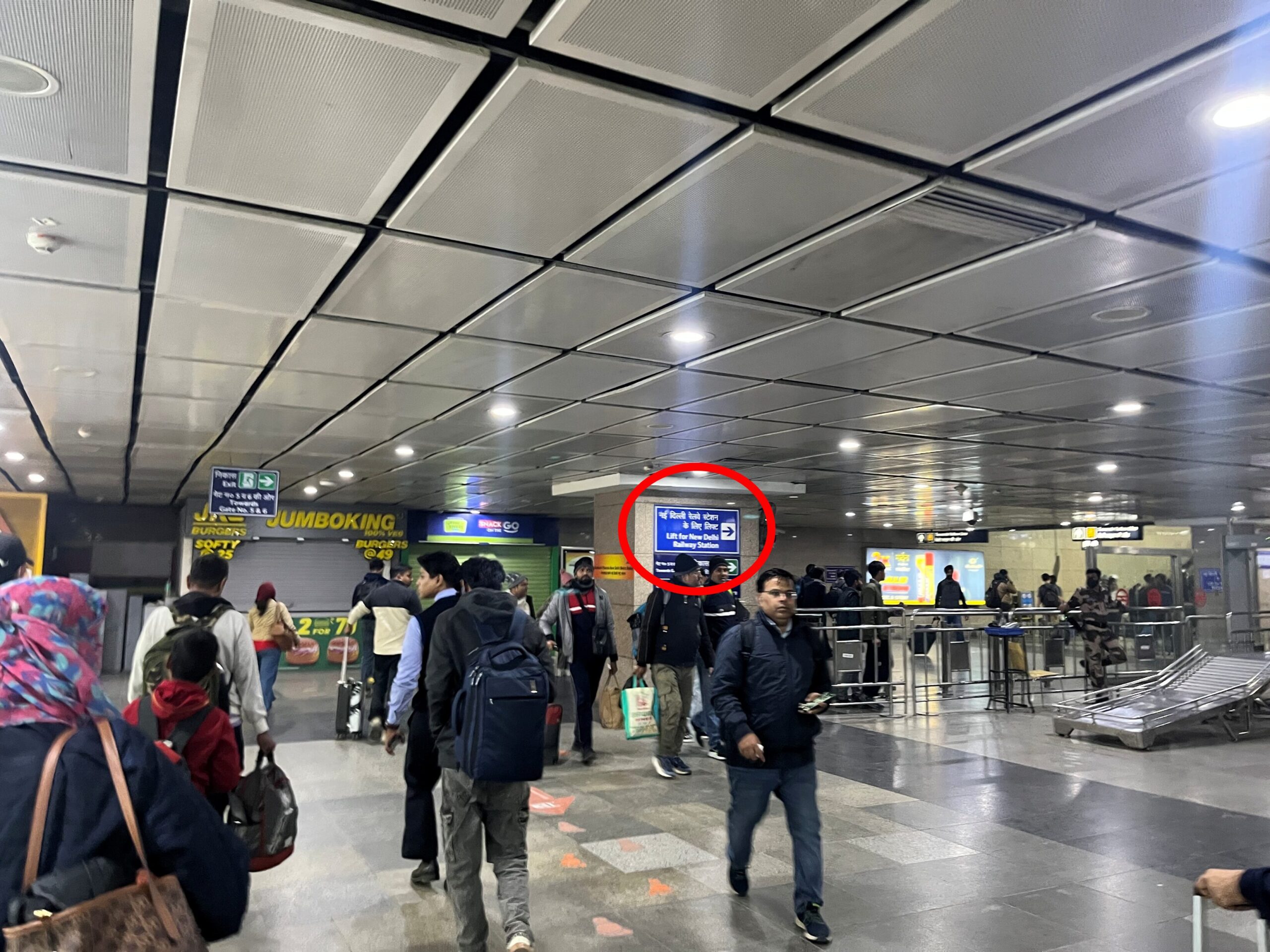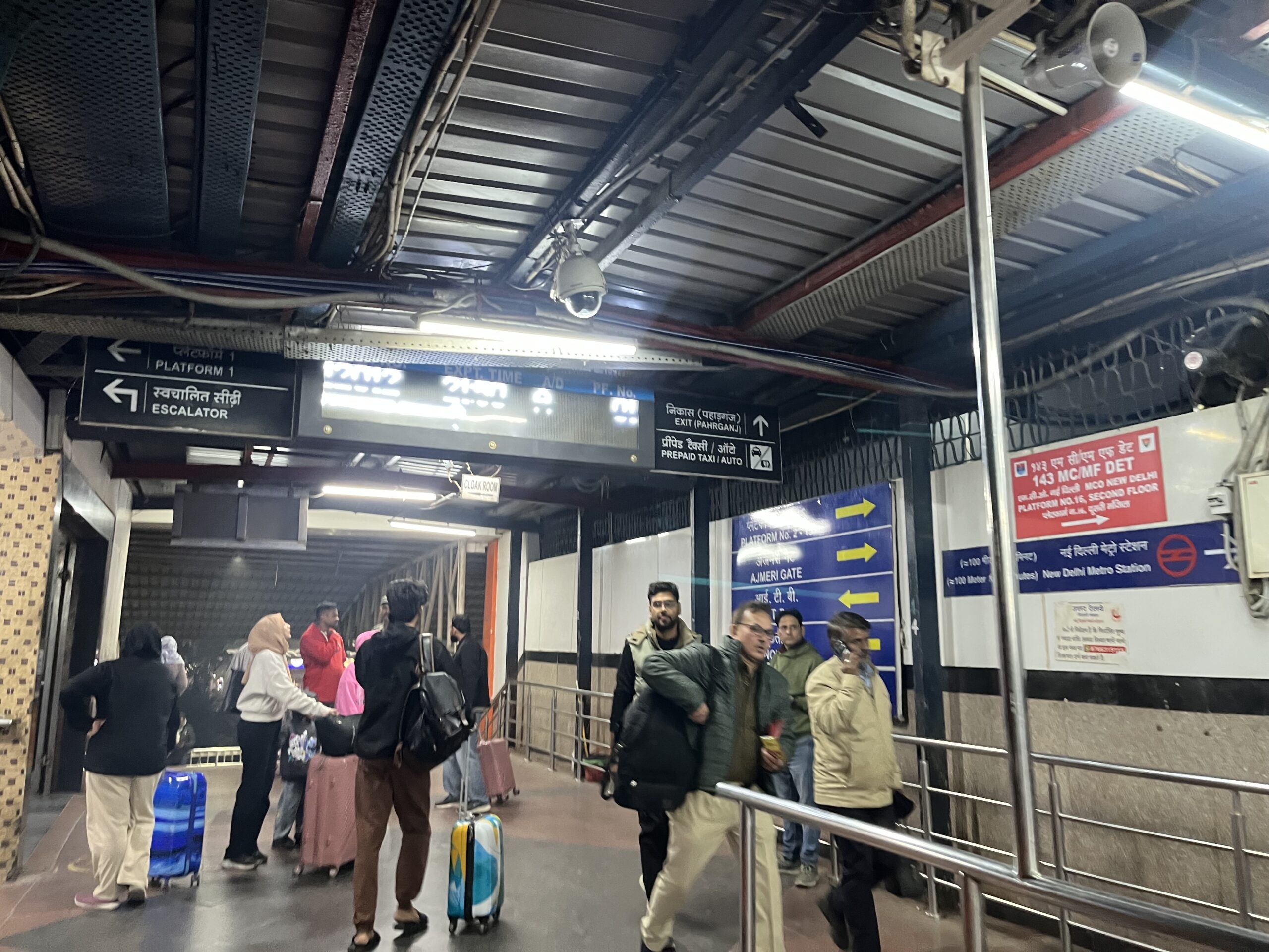 改札を出たら左側に「Lift For New Delhi Railway Station」と書かれた青い案内がありますので、これに従って手荷物検査の横を通り抜けてエスカレーターで地上に上がります。