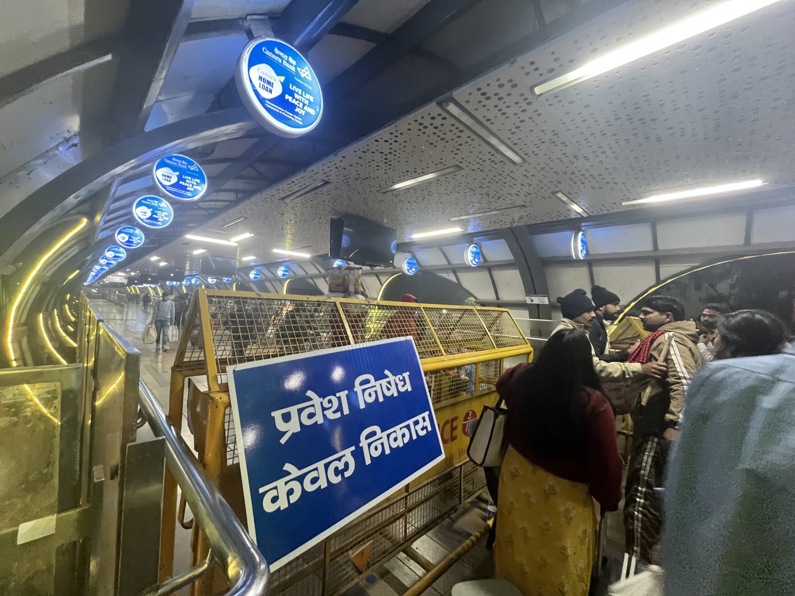 このゲートに掲げられている青い案内には、ヒンディー語で「入場禁止。退場のみ。」と記載されています。