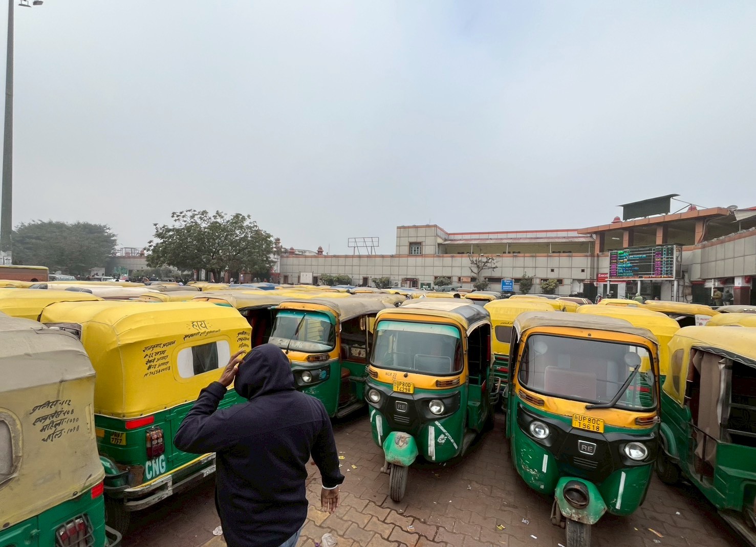 アグラ駅前にはたくさんのオートリキシャとタクシーが停車しています。