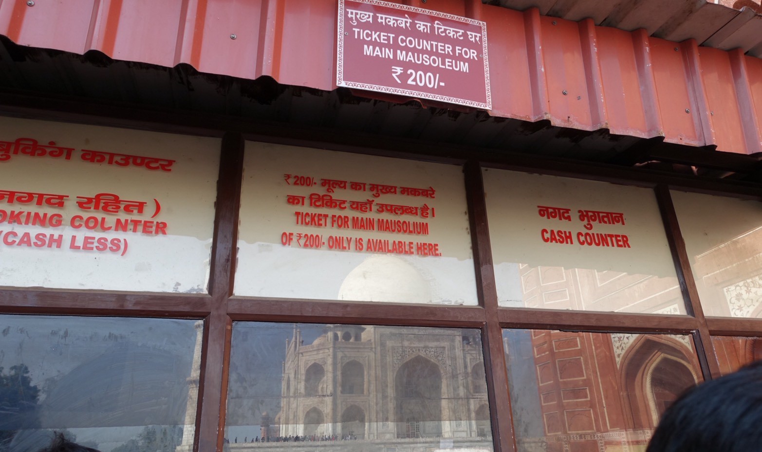 一体となったチケットを購入していない場合は、タージマハル内のこちらの窓口でチケット(200ルピー)を購入する必要があります。