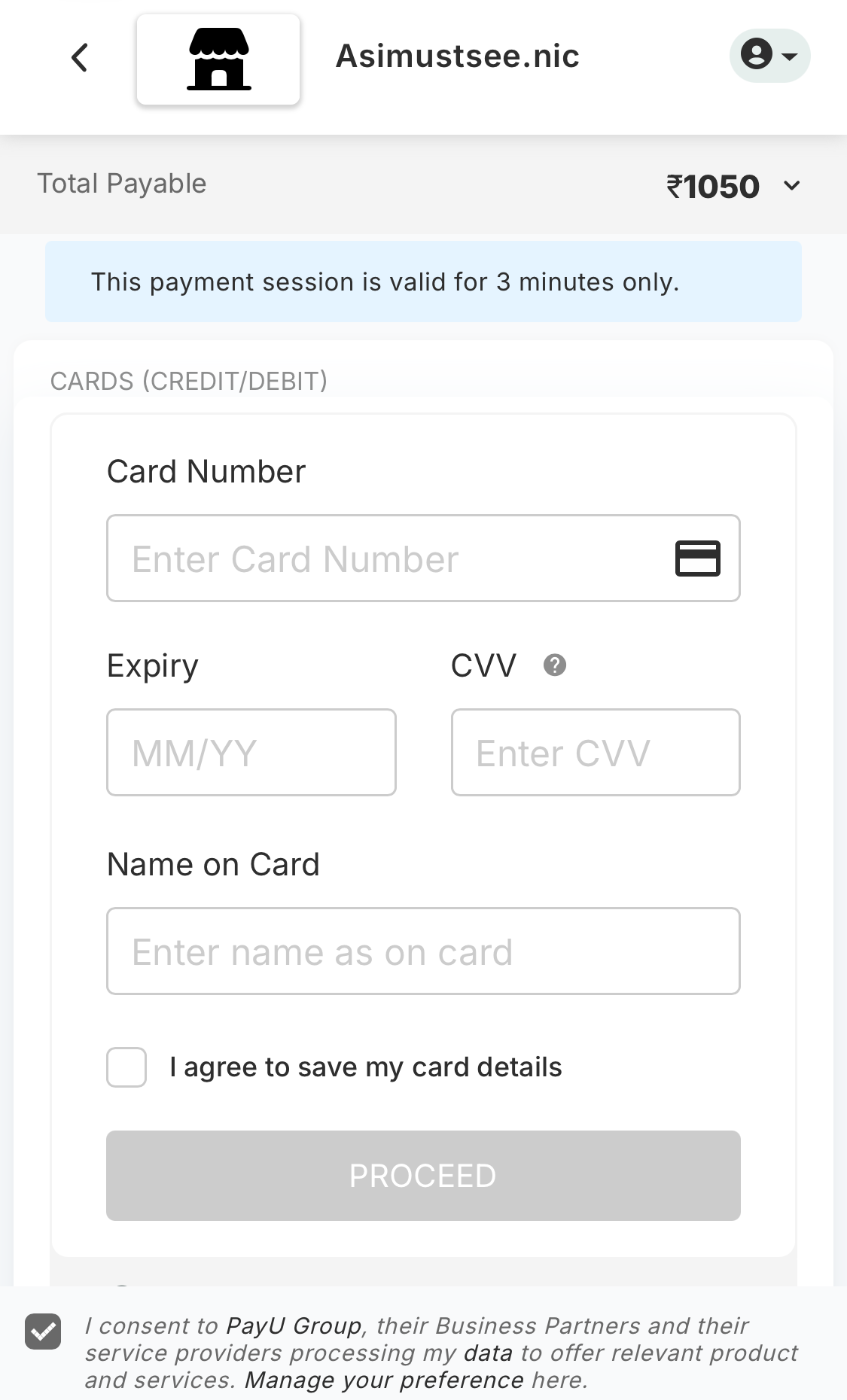 ④カード番号を入力して「PROCEED」を選択