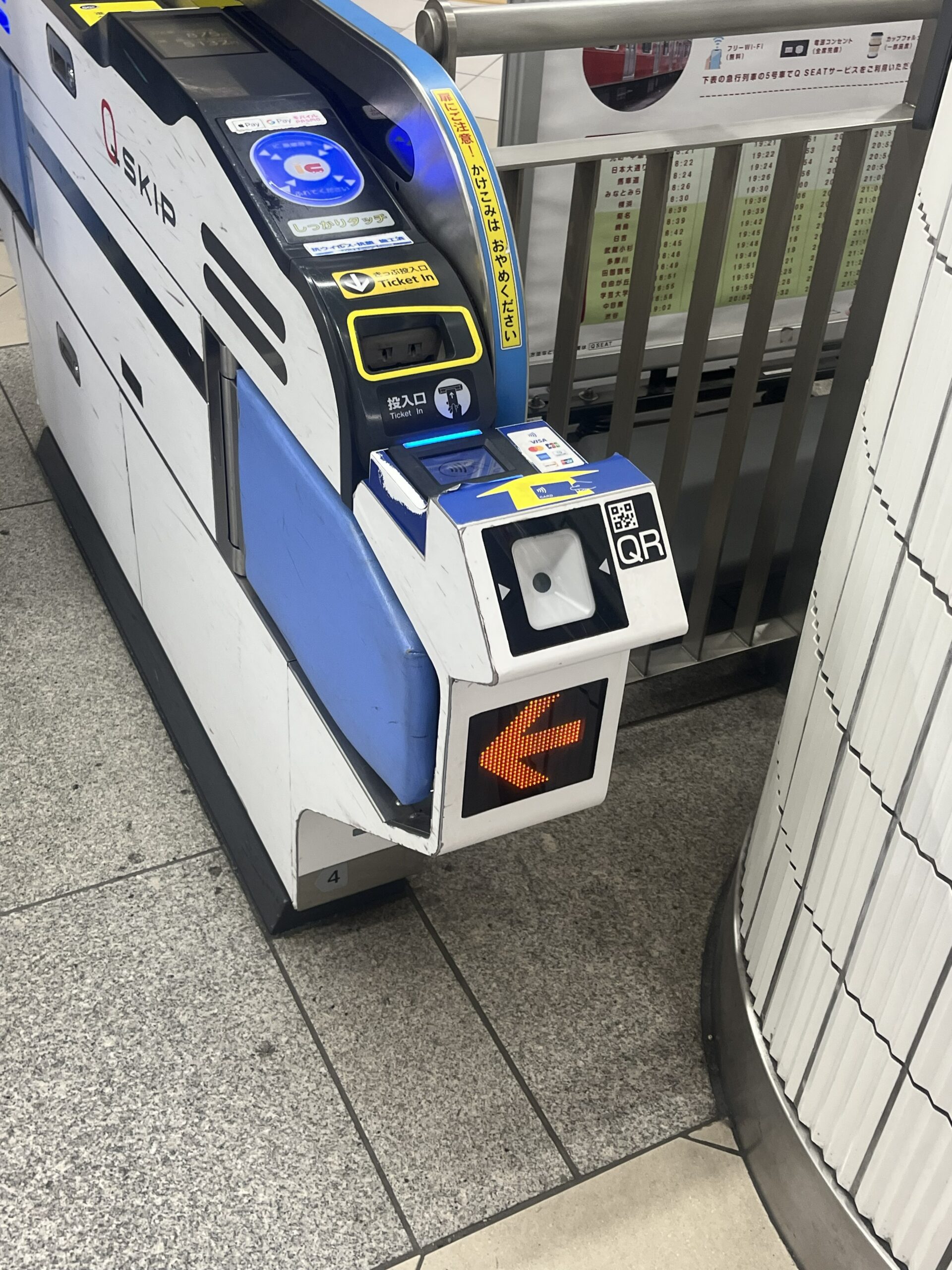 QRと書かれたガラス部分に、先ほどのQRコードを読み取らせれば、ポンと音がなるので、これで改札の通過が可能です。