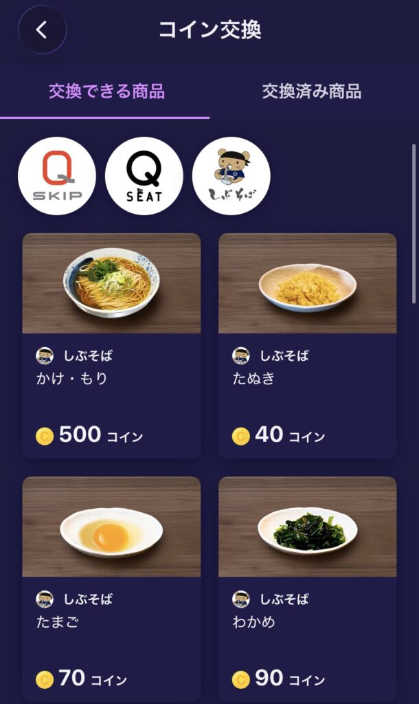 貯まったコインは、東急線の乗車パスや、しぶそばの商品とも交換が可能です。