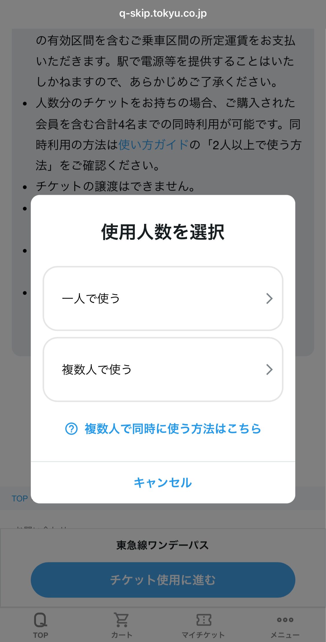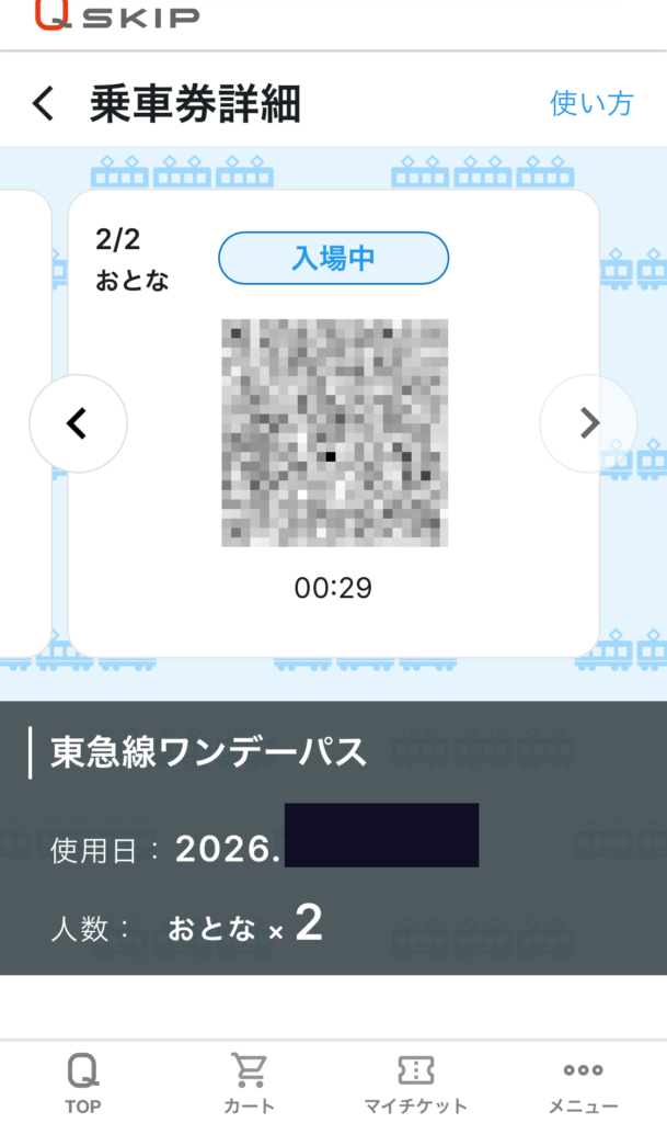 なお、同時に利用する同行者のスマホでQ-SKIPのWEBページにログインすれば、それぞれのスマホでQRコードを表示することができるので、改札を通るときにスムーズです。