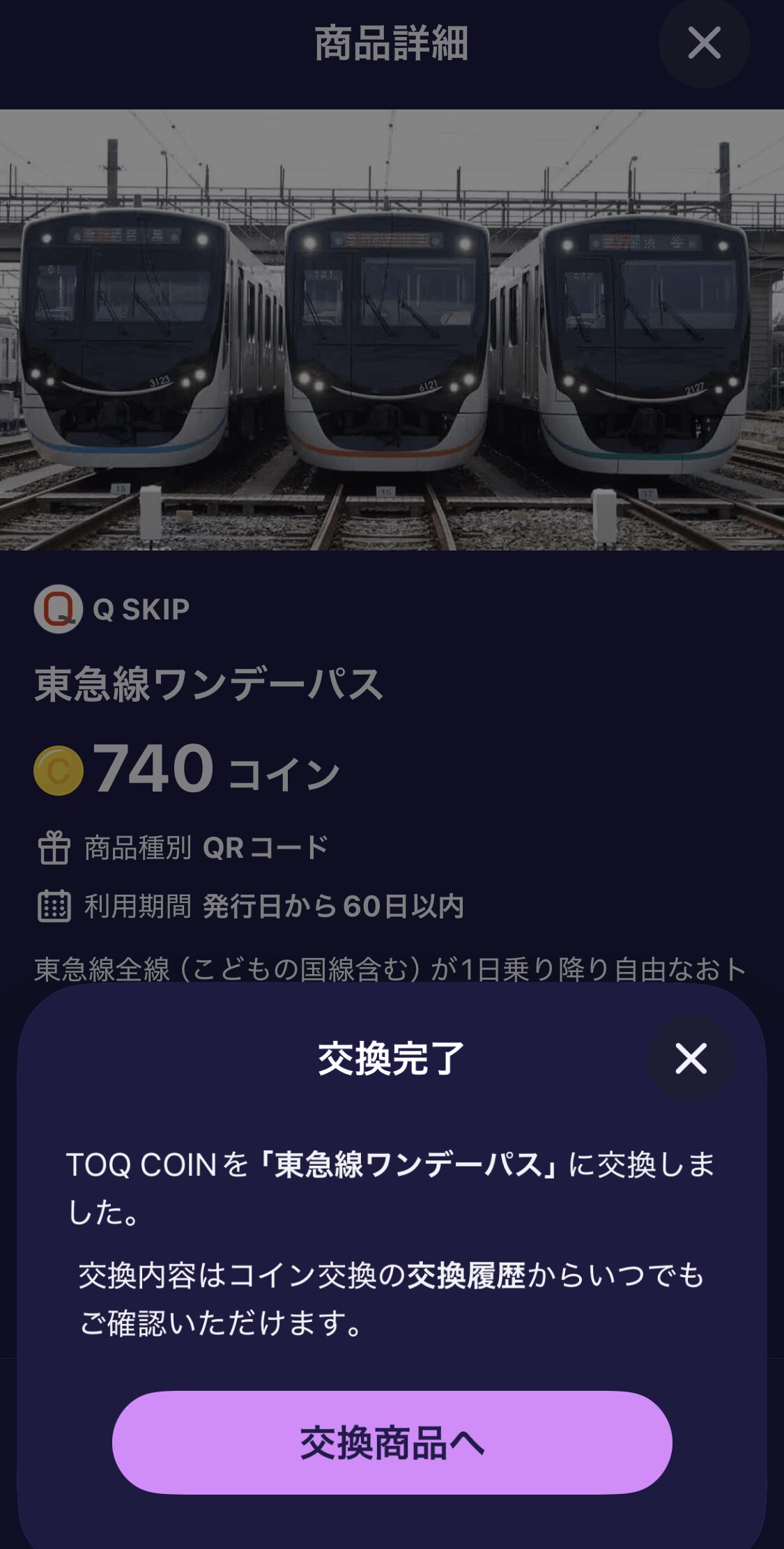 TOQ COINを交換するには、東急線アプリにて、次の操作で可能です。